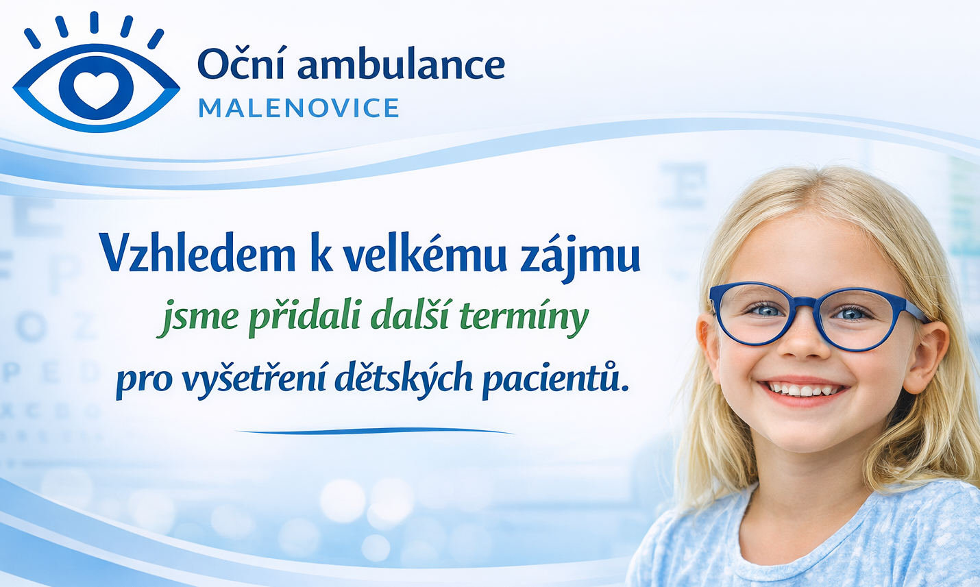 Od 5.1.2026 nás najdete znovu v 1. patře zdravotního střediska v nových zrekonstruovaných prostorách s moderním vybavením a navíc nově i s plně vybavenou ortoptickou cvičebnou a dětskou oční ambulanci (více zde).
